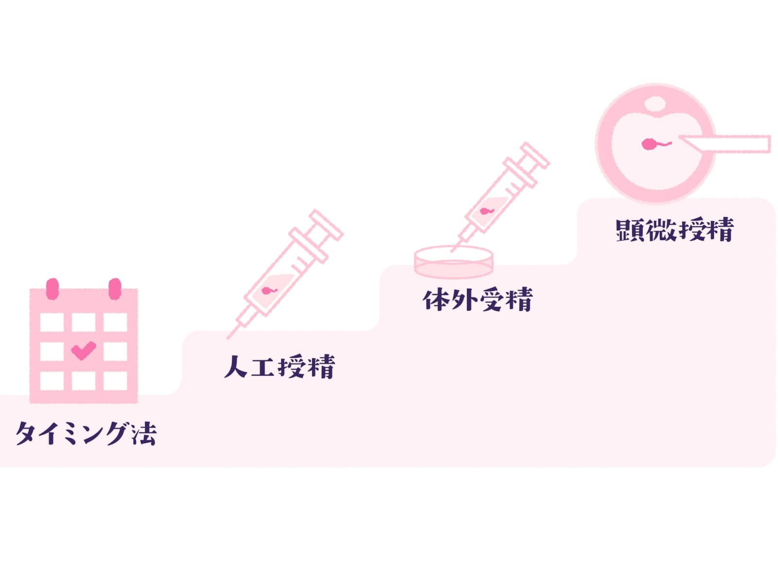 段階的なご提案不妊治療について、基本的には自然妊娠を促すタイミング療法から行い、様子をみながら人工授精、病院で行う体外受精とステップアップしていく治療を提案します。